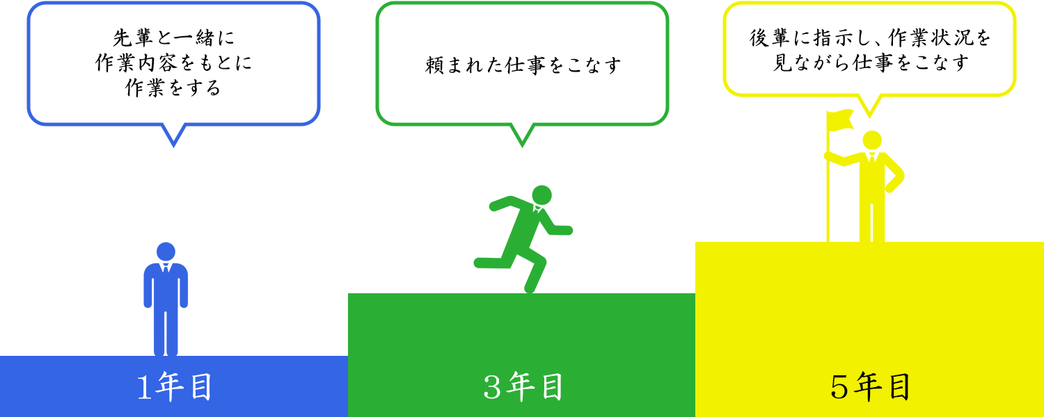 | 職務の目的 | 様々な現場と仕事を経験しながら機械器具据付の施工管理を目指す | これまでの経験を活かし当社のやり方の良い所を身に付け、上記のレベルを目指す |